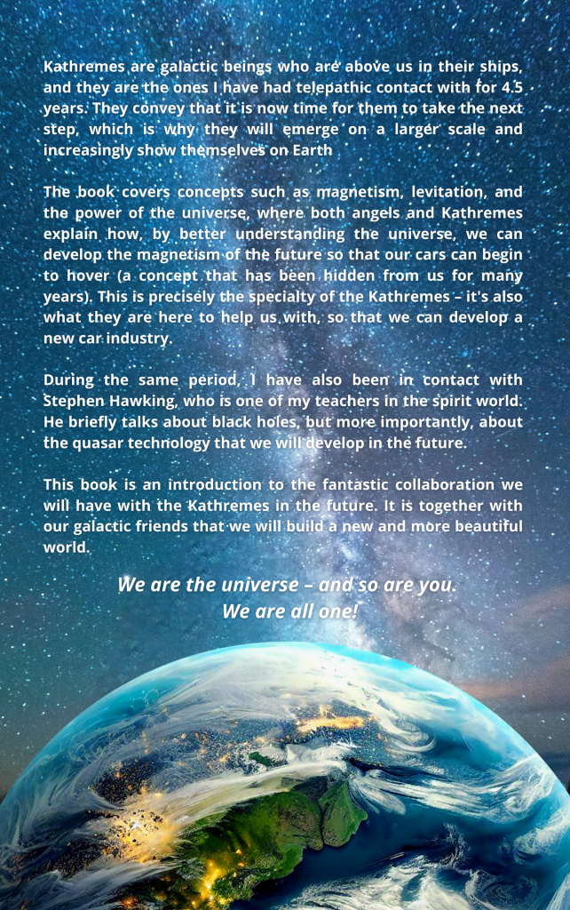Framför allt är jag här för att delta i den återuppbyggnad som kommer att ske i framtiden. Därför förmedlar jag nu de kunskaper som universum har givit mig. Det är kunskaper som jag har lärt mig både i andevärlden och på andra planeter där jag verkade som en vetenskaplig medspelare – elev. Därav min telepatiska kontakt med galaktiker – Kathremerna.